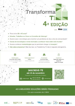 A 4ª Edição do TRANSFORMA TI Valongo está quase a começar. As inscrições para jovens dos 15 ao 45 anos de idade terminam no dia 15 de novembro: https://cdi.org.pt/transforma-ti-4a-edicao/