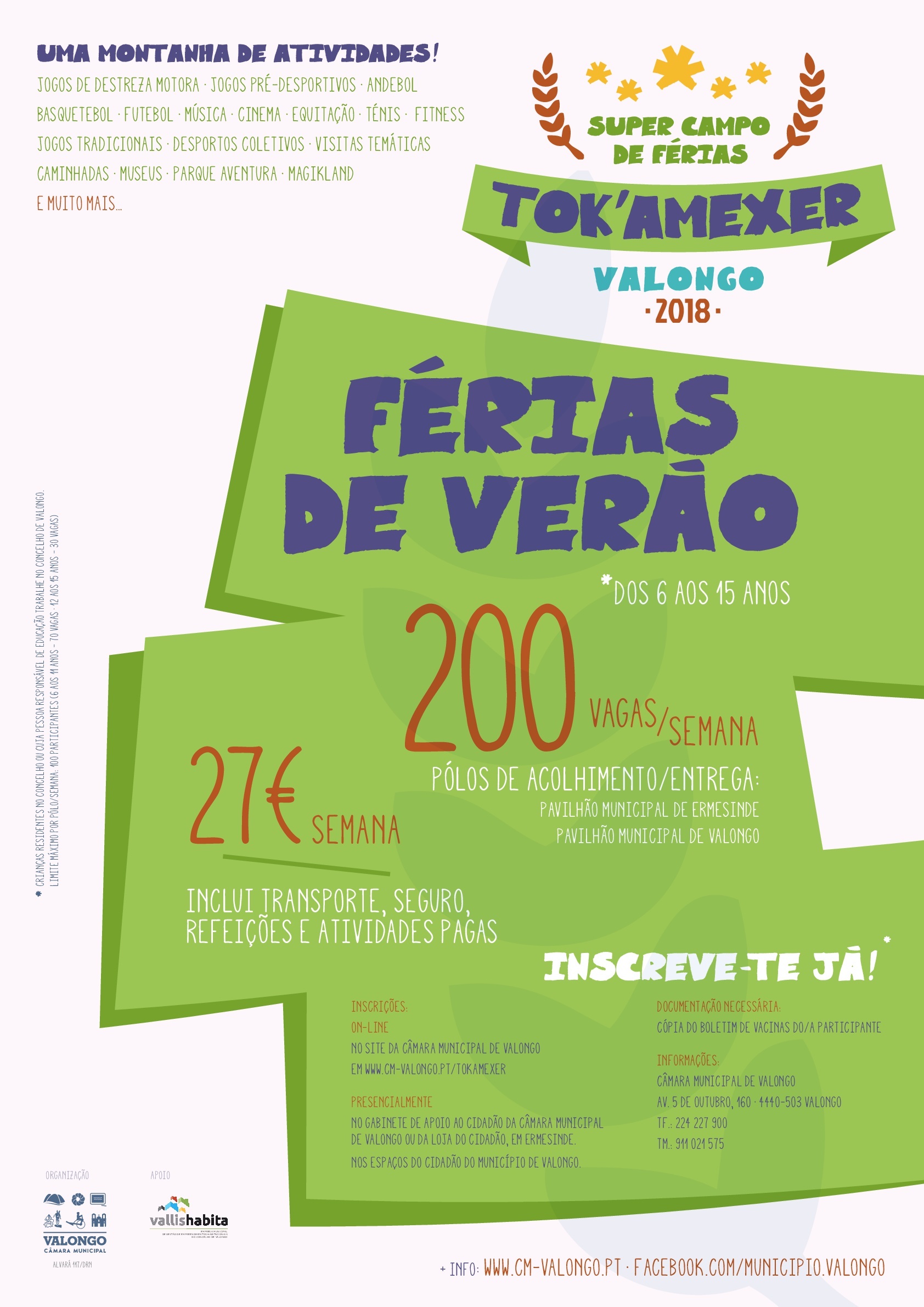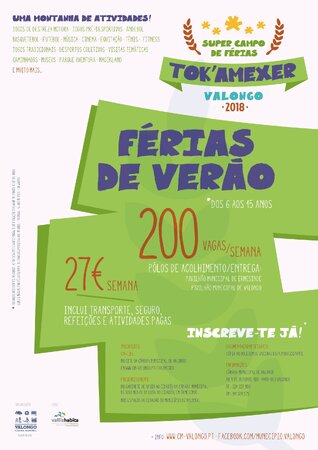 A Câmara Municipal de Valongo, entidade promotora de campos de férias com o alvará 117/ DRN volta a promover o TOK’A MEXER VALONGO – FÉRIAS DE VERÃO 2018, dirigido a crianças/jovens residentes ou estudantes no concelho ou cujo responsável de educação trabalhe no Concelho de Valongo.
