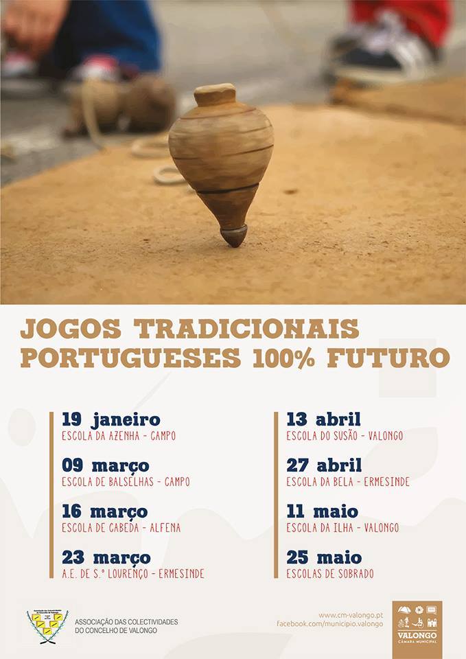 Esta iniciativa resulta de uma parceria da Associação das Coletividades do Concelho de Valongo com a Câmara Municipal de Valongo. As ações de demonstração de jogos tradicionais portugueses junto da população escolar infantil têm como objetivo promover a cultura desportiva dos jogos populares, contribuindo desta forma para o desenvolvimento motor, cognitivo e social das crianças. Ao longo do ano letivo, o projeto «Jogos Tradicionais Portugueses 100% Futuro» vai passar por várias escolas do primeiro ciclo do ensino básico, no âmbito do Plano de Ação do Projeto Educativo Municipal. O pião, a cabra cega, a malha, a corrida de sacos e o pé atado são apenas alguns dos exemplos das dezenas de jogos que as crianças podem experimentar.