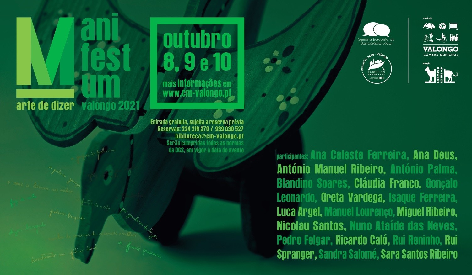 A Poesia, esse “condensado de mundo”, como alguém a descreveu, vai ter mais do que rédea longa, vai soltar amarras e percorrer diversos espaços do concelho de Valongo entre os dias 8 e 10 de outubro (sexta a domingo): desde o Fórum Cultural Vallis Longus à Oficina da Regueifa e do Biscoito, passando também pela Biblioteca Municipal e pelo Fórum Cultural de Ermesinde. Importa lembrar que as escolas do concelho são também unidades que viabilizam o ‘Manifestum’. A iniciativa Manifestum arte de dizer é da responsabilidade da Câmara Municipal de Valongo e a produção está a cargo da Exemplo Extremo.