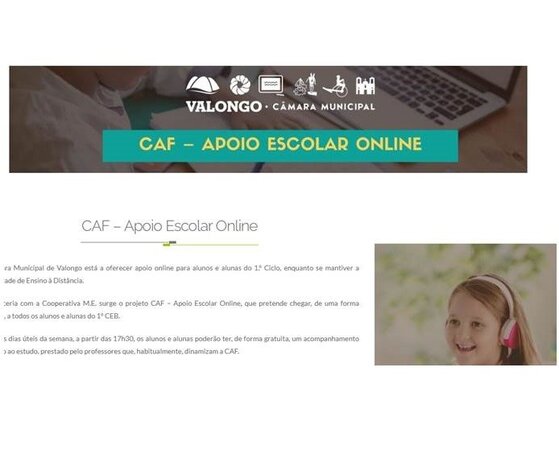 Nesta medida, e em parceria com a Cooperativa Múltipla Escolha, surge o projeto CAF – Apoio Escolar Online, que pretende chegar, de uma forma gratuita, a todos/as os/as alunos e alunas do 1º CEB. Com esta resposta pretende-se que, apesar dos tempos em que vivemos, todas as famílias e os seus/suas educandos/as tenham uma oferta de qualidade que os poderá auxiliar no ensino à distância, que pode fazer emergir novas barreiras à aprendizagem.