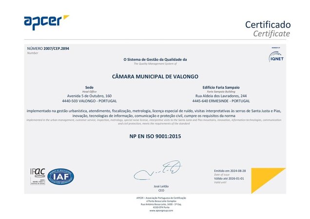 Nos dias 20, 26 e 28 de junho decorreu a auditoria anual realizada pela APCER, entidade certificadora do Sistema de Gestão da Qualidade (SGQ) implementado no Município de Valongo.