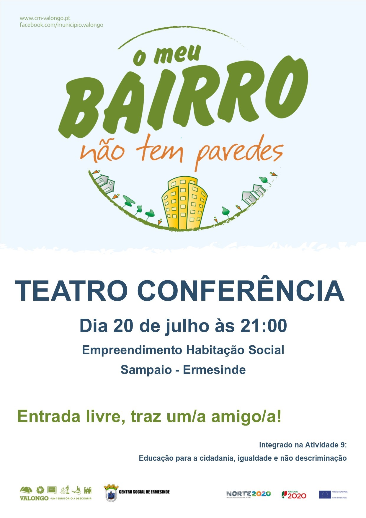 Em sequência da dinamização das atividades previstas no âmbito do Projeto "O meu Bairro Não tem Paredes" será realizado no próximo dia 20 de julho, às 21h00 um Teatro Conferência intitulado “Pedaços de Violência” no Empreendimento de Habitação Social de Sampaio, sob a responsabilidade do Centro Social de Ermesinde (elemento constituinte do Consórcio deste Projeto) em parceria com a Associação “Cabeças no Ar e Pés na Terra”.