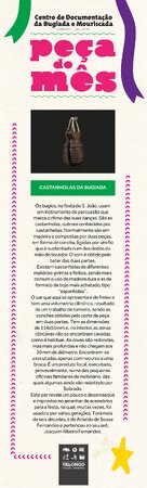 O Centro de Documentação da Bugiada e Mouriscada, retomando a atividade Peça do Mês, exibe, durante abril, um par de castanholas.