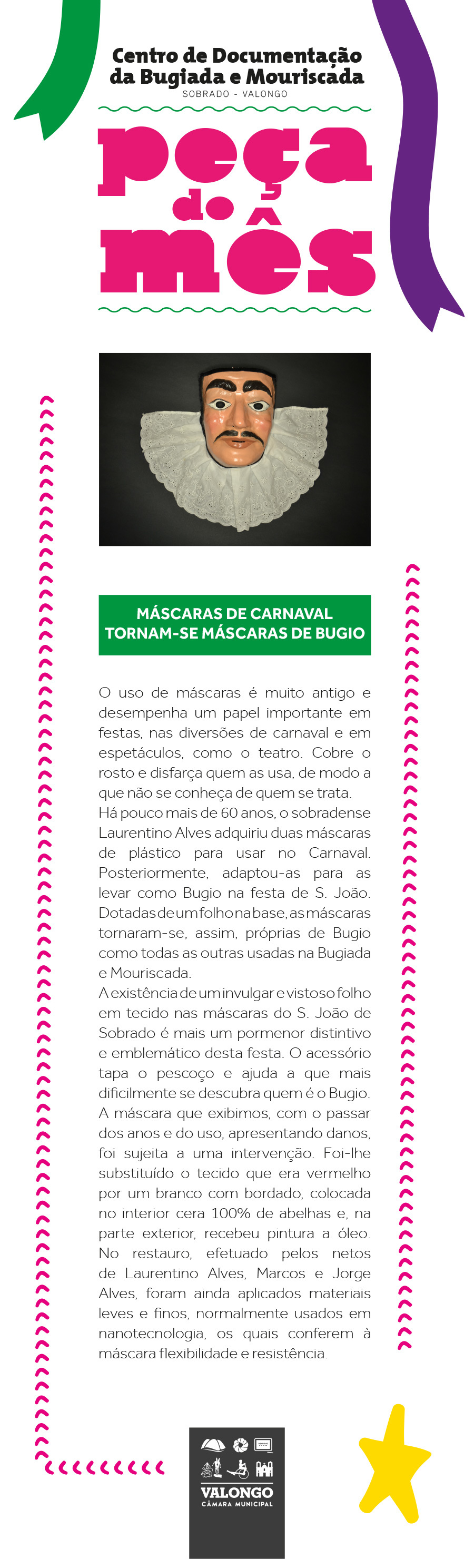 O Centro de Documentação da Bugiada e Mouriscada expõe mais uma Peça do Mês. Trata-se de uma máscara, com mais de seis décadas, adquirida por um sobradense para uso em festejos carnavalescos. Esta careta, no entanto, logo recebeu uma adaptação para uso na festa de S. João de Sobrado.