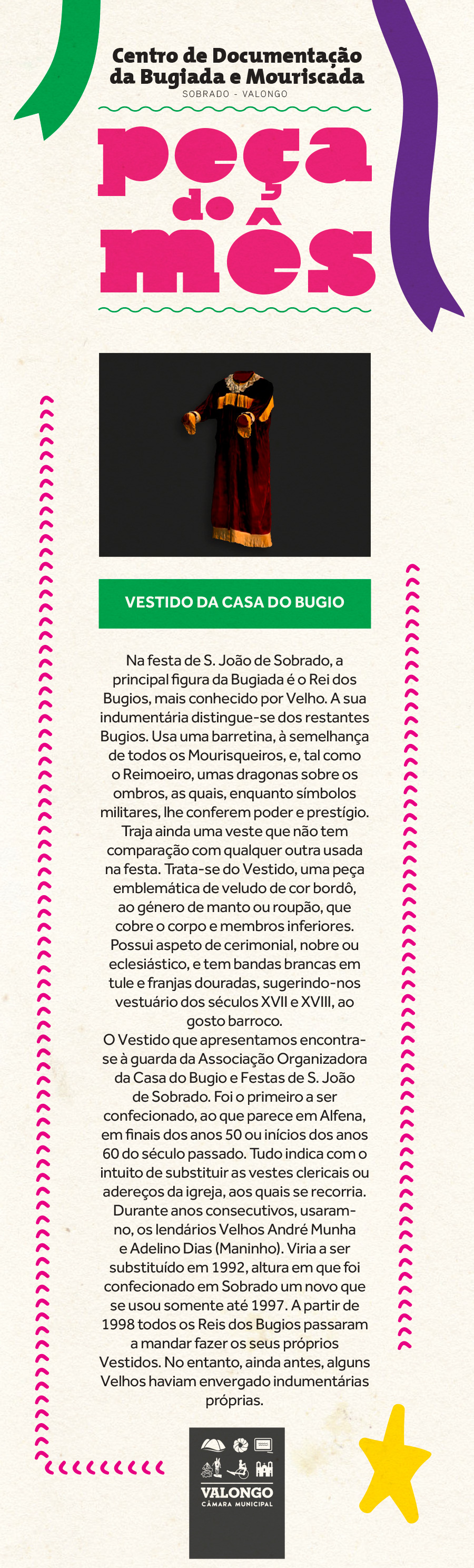 O Centro de Documentação da Bugiada e Mouriscada, de 1 a 30 de junho, exibe como Peça do Mês o "Vestido da Casa do Bugio".