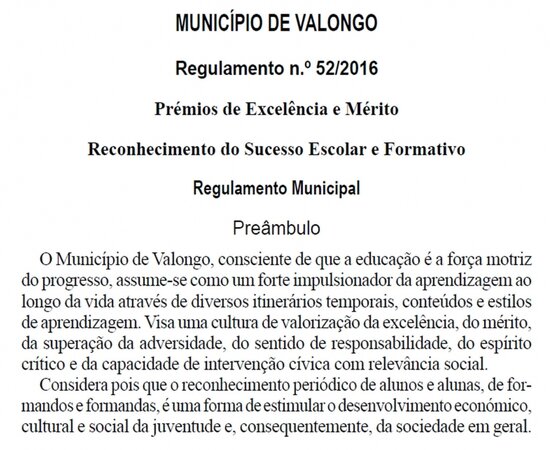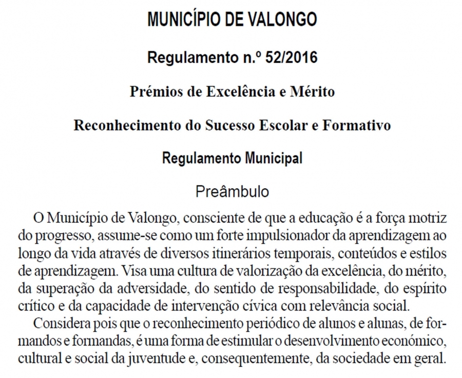 Está aberto o período de candidatura aos Prémios de Excelência e Mérito, uma iniciativa da Câmara Municipal de Valongo que visa distinguir pela excelência do seu desempenho, trabalho e resultados escolares e formativos, pela sua atitude cívica, pela dimensão do seu esforço e/ou progressos alcançados, participação desportiva ou por outras razões consideradas exemplares para os restantes elementos da comunidade educativa, sendo instituído nas suas diferentes categorias. nos termos do regulamento e do anúncio de abertura de candidaturas em anexo.