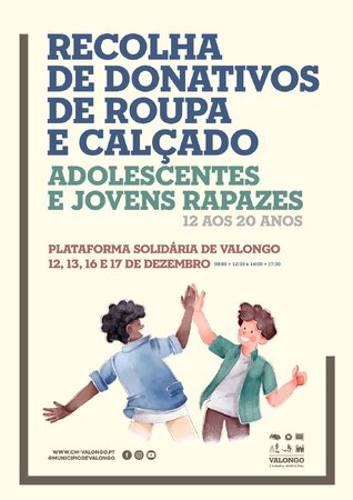 A Plataforma Solidária de Valongo está a promover uma campanha de Recolha de Donativos para colmatar a escassez de stock de roupa de rapaz (dos 8 aos 20 anos). A recolha irá decorrer nos dias 12,13,16 e 17 de dezembro, das 9h00 às 12h30 e das 14h00 às 17h30, nas instalações do Largo do Centenário, em Valongo.