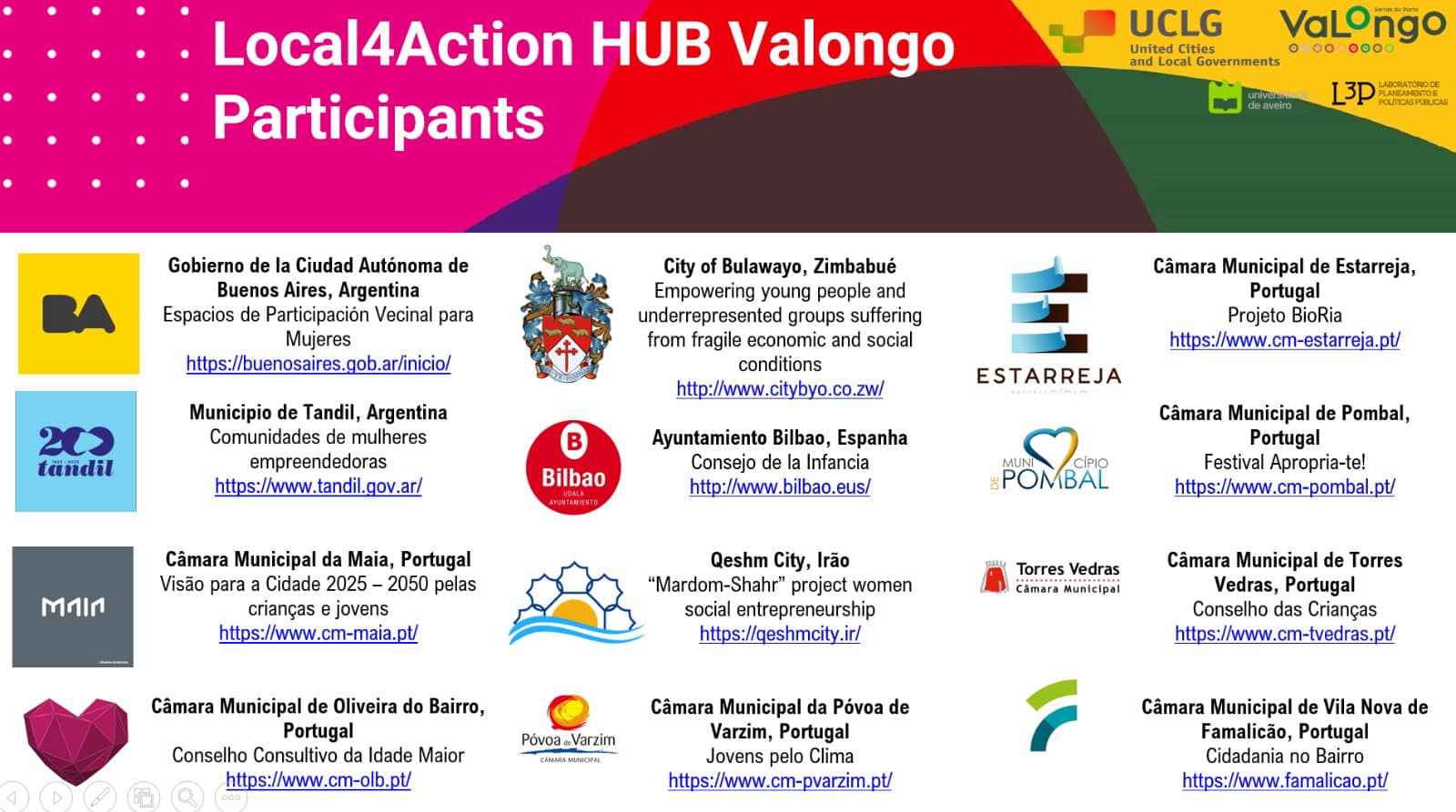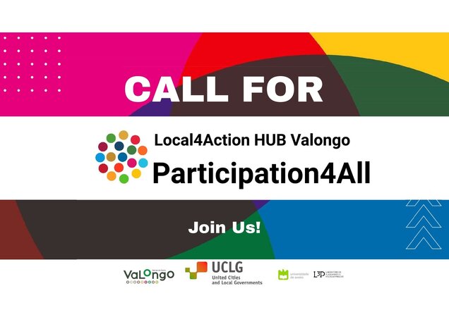 A convocatória de projetos à Rede Local4Action Hub de Valongo foi um enorme êxito. Foram recebidas 46 propostas de Municípios de quatro continentes - Europa, América, Africa e Ásia - um sinal da importância e oportunidade desta iniciativa, impulsionada pelo United Cities and Local Government – UCLG e pelo Município de Valongo, que promove o envolvimento de grupos sub-representados em processos participativos. Após a avaliação do júri, constituído por docentes e investigadores da Universidade de Aveiro, parceiro científico do projeto, foram selecionadas sete propostas de Portugal e cinco propostas de países estrangeiros (Argentina, Espanha, Irão e Zimbabué) cujo foco da atenção são, sobretudo, as mulheres, crianças, jovens e idosos. A lista completa é a seguinte: