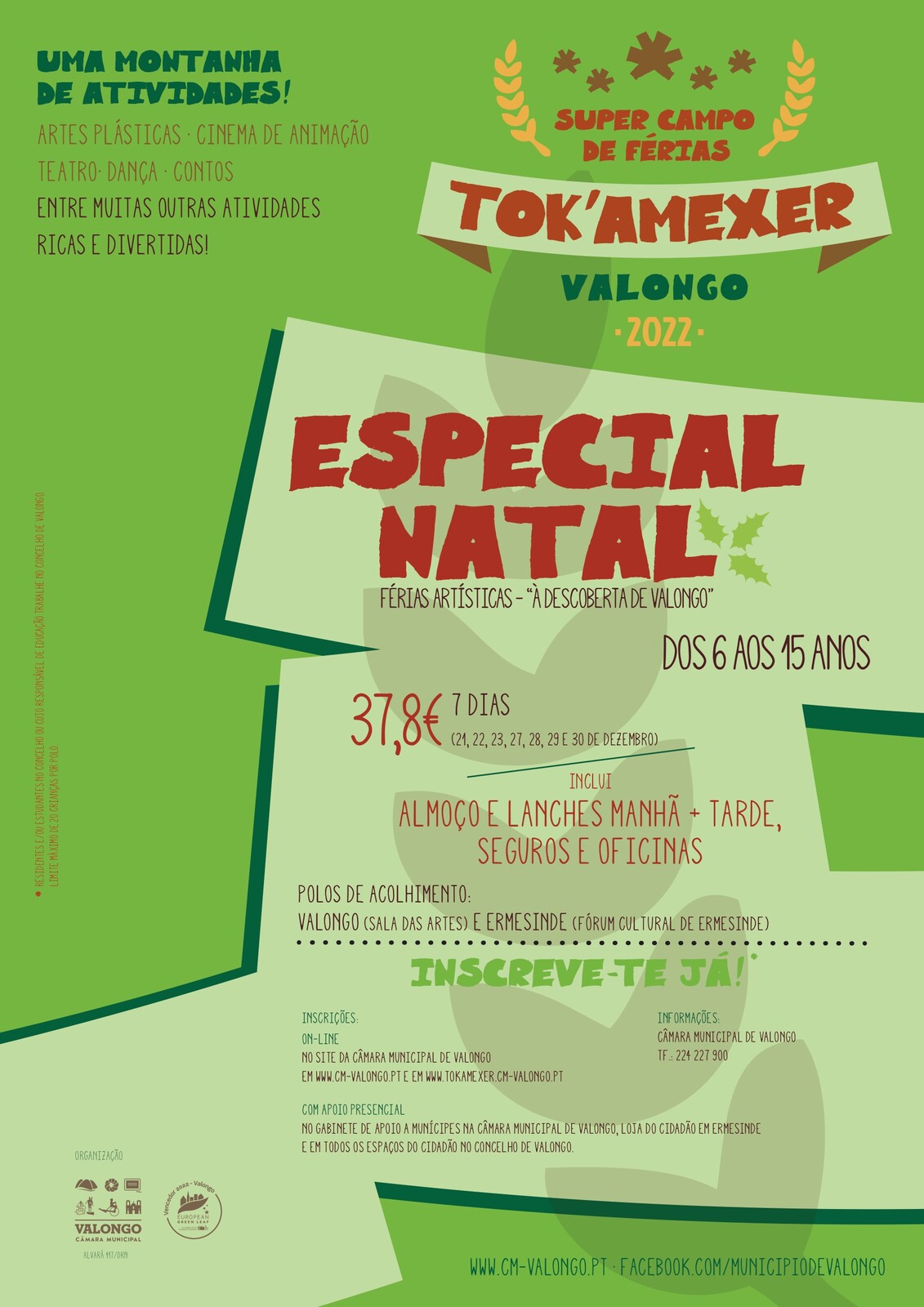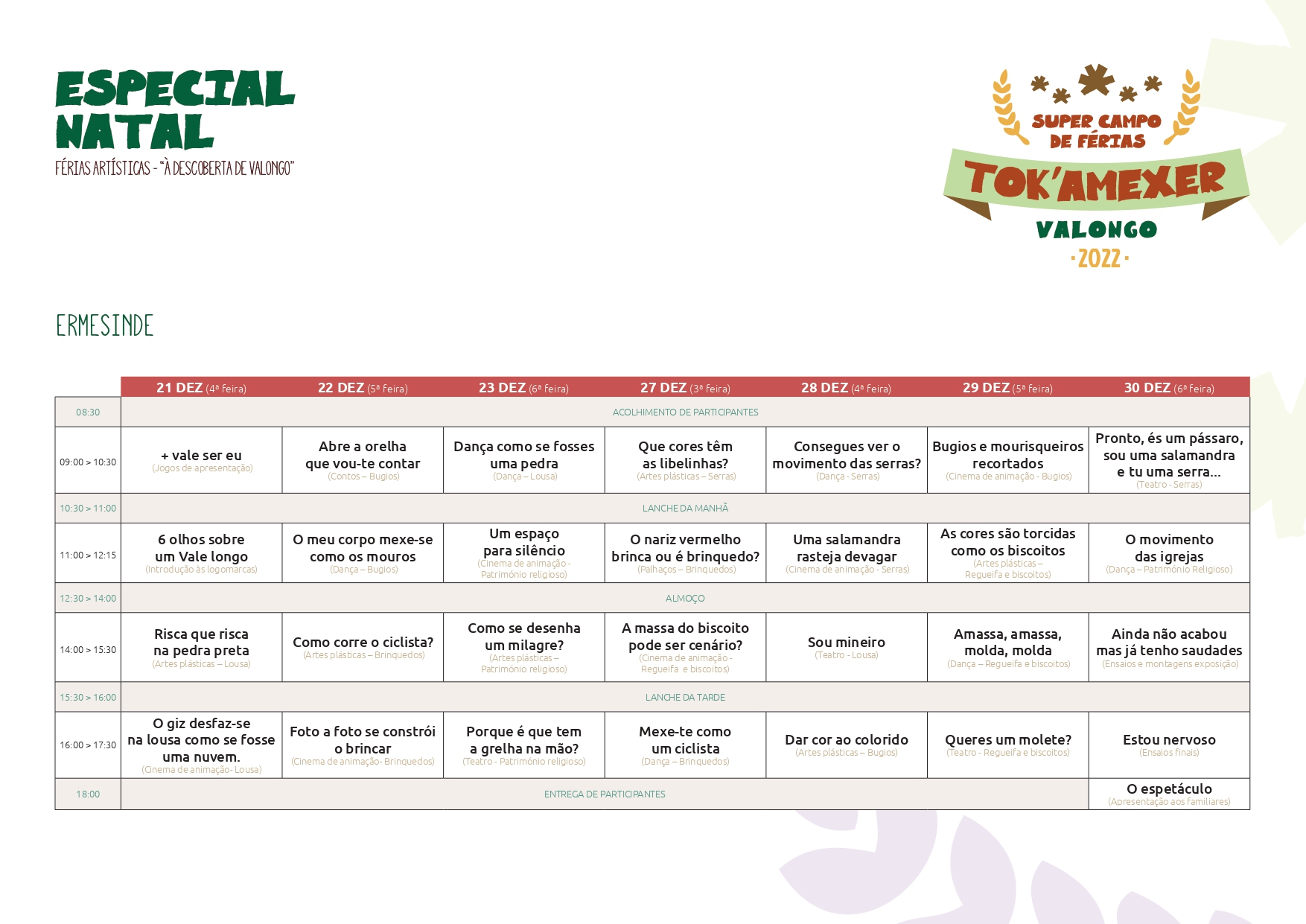 Destinado a jovens com idade entre os seis e os 15 anos, a edição de Natal de 2022 irá decorrer nos dias 21, 22, 23, 27, 28, 29 e 30 de dezembro e terá o custo de 37,80€/. Serão criados dois grupos de 20 participantes cada, um na Sala das Artes (Valongo) e outro no Fórum Cultural (Ermesinde) e