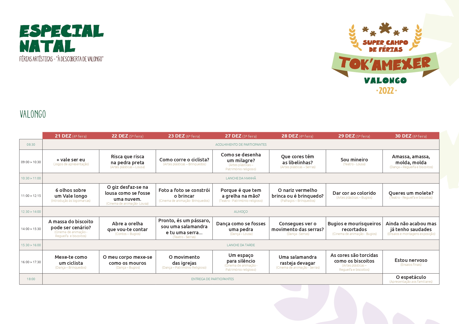 O Programa de Férias TOK’A A MEXER VALONGO está de regresso nas férias de Natal e tem como missão partir “À Descoberta de Valongo”! Ao longo de sete dias decorrerão diversas atividades artísticas que exploram o TEATRO, a DANÇA, as ARTES PLÁSTICAS, CINEMA e CONTOS num conjunto de oficinas onde, de uma forma divertida, será possível aprender mais sobre o concelho de Valongo.