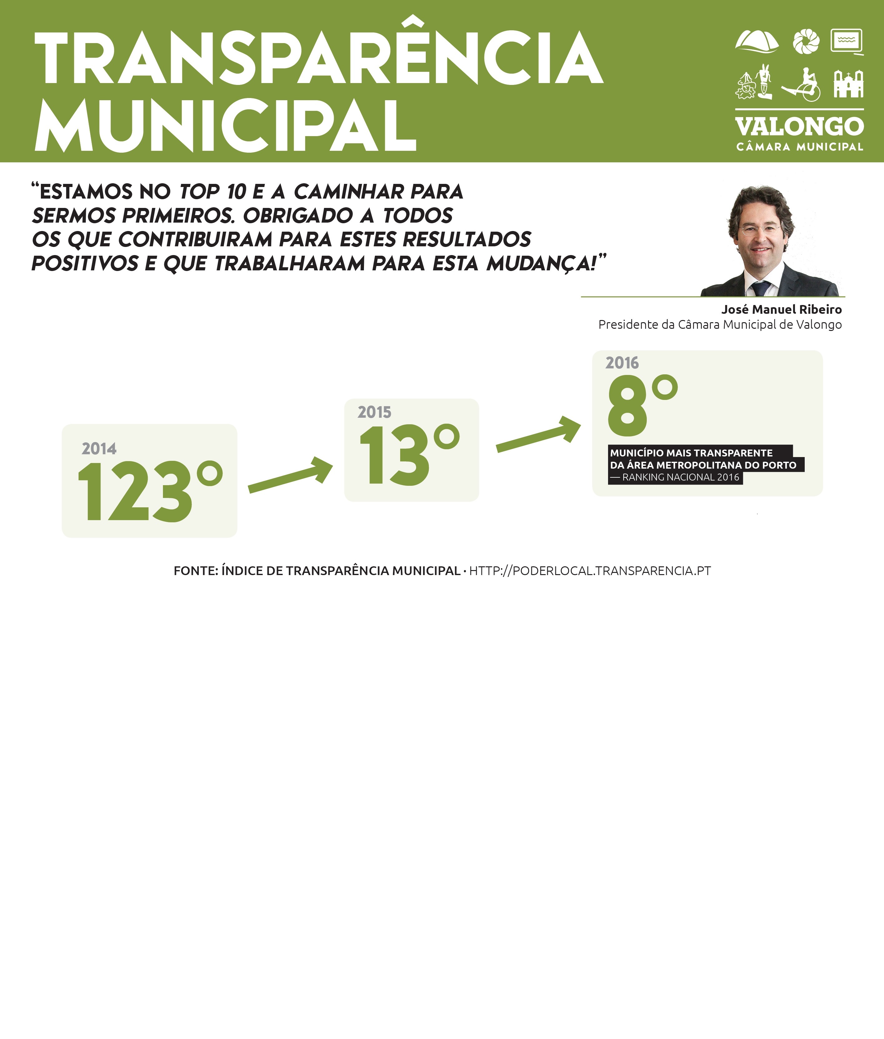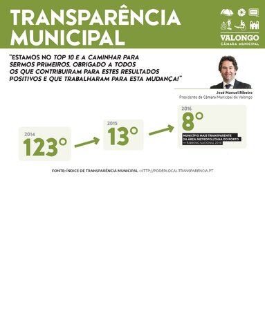 Em 8.º lugar, Valongo é o Município da Área Metropolitana e de todo o distrito do Porto mais bem posicionado no Índice de Transparência Municipal 2016 (ITM). “Estamos no Top 10 e a trabalhar para sermos primeiros! Agradeço a todos os que nos acompanharam nesta caminhada e que contribuíram para alcançarmos estes resultados tão positivos”, congratula-se o Presidente da Câmara Municipal de Valongo, José Manuel Ribeiro.