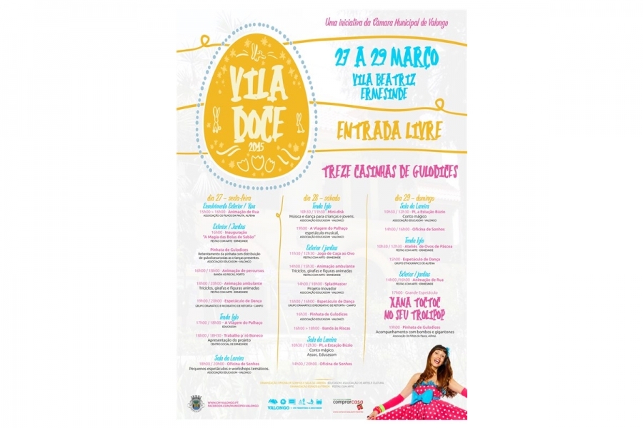 Breve descrição: À imagem dos ovos da páscoa que tantas surpresas escondem, a Vila Doce foi estruturada para que cada casinha de madeira albergasse uma surpresa doce alusiva à Páscoa e à chegada da Primavera. Apostou-se na interatividade com os mais novos, de modo a estimular a sua curiosidade e a contribuir para que sonhem e aprendam. Com entrada livre, o público teve acesso um programa cultural variado acompanhado pela exposição e venda de guloseimas (pão-de-ló, ovos-moles, crepes, licores, amêndoas e outras iguarias associadas a esta época festiva).